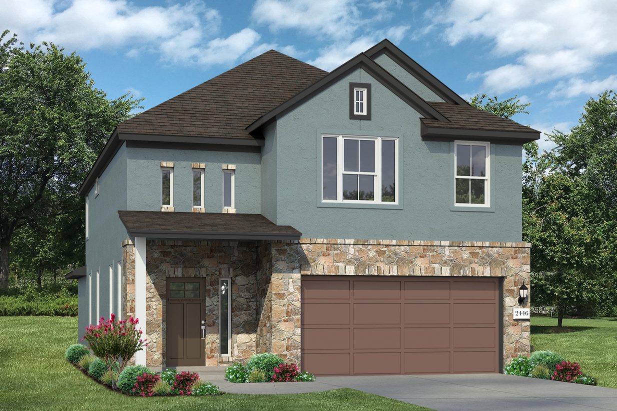 Rendering of two story home with earth toned masonry, green accent, and brown garage surrounded by landscape and blue sky.